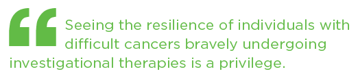 The most satisfying part of my position is the time spent with patients and their families. Seeing the resilience of individuals with difficult cancers bravely undergoing investigational therapies is a privilege. Helping them to manage symptoms and live their best lives for as long as they may have brings me joy and satisfaction. As most professionals working in oncology, I continue to learn valuable life (and death) lessons from my patients.
